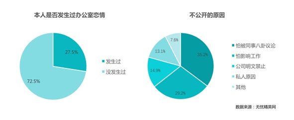 近日,无忧精英网对 2690 名职场精英开展了办公室恋情情况的问卷调查。调查结果显示,有 27.5% 的受访对象曾发生过办公室恋情,仅半数选择公开恋情,不过 64.5% 的人表示身边的办公室恋情以失败告终,而且 68.4% 的企业在一定程度上不希望员工发生办公室恋情。