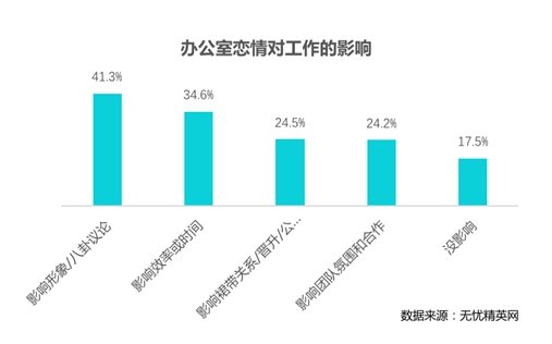 虽然办公室恋情不少见,但仅有 17.5% 的精英对办公室恋情表示支持,不支持的比例高达 43.8%,最重要的原因是担心对工作产生不良影响。其中,最让他们担心的是被同事八卦议论,占 41.3%,其次是担心影响工作效率和时间、影响裙带关系 / 晋升 / 公平性、影响团队氛围和合作。