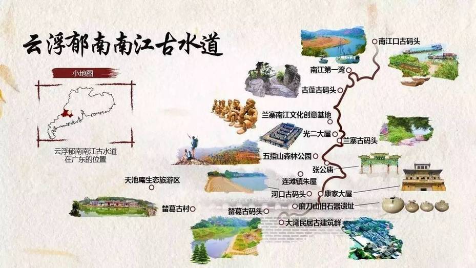 郁南南江古水道(兰寨—大湾古码头)全长28.5公里,是示范区中唯一的古水道,是古代海上丝绸之路的重要连接通道。