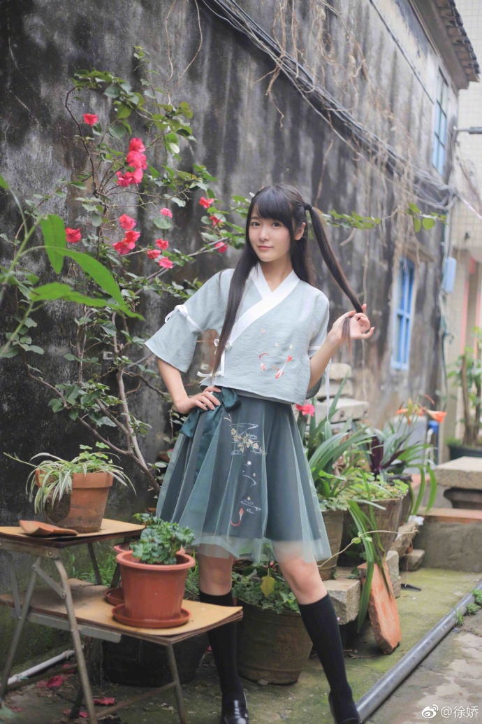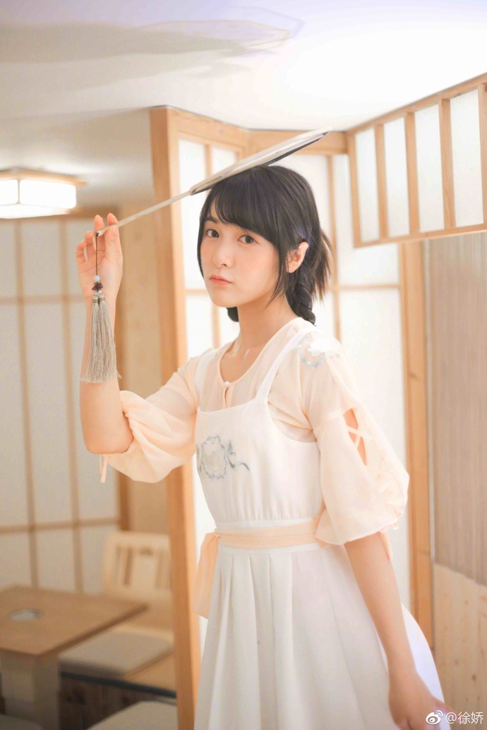 4月17日,徐娇在微博晒出最新写真照,穿着白裙十分清纯,拿着扇子古典韵味十足,双马尾超可爱。