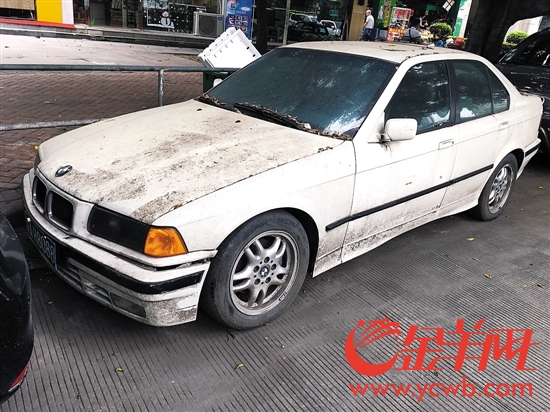 一辆粤AH8088的白色宝马车落满灰尘和树叶,停在一颗榕树底下,显得有些狼狈。其中两只轮胎已经瘪了,前车灯处已经开裂,记者在车窗上看到车辆年检日期到2011年,之后就没有了。