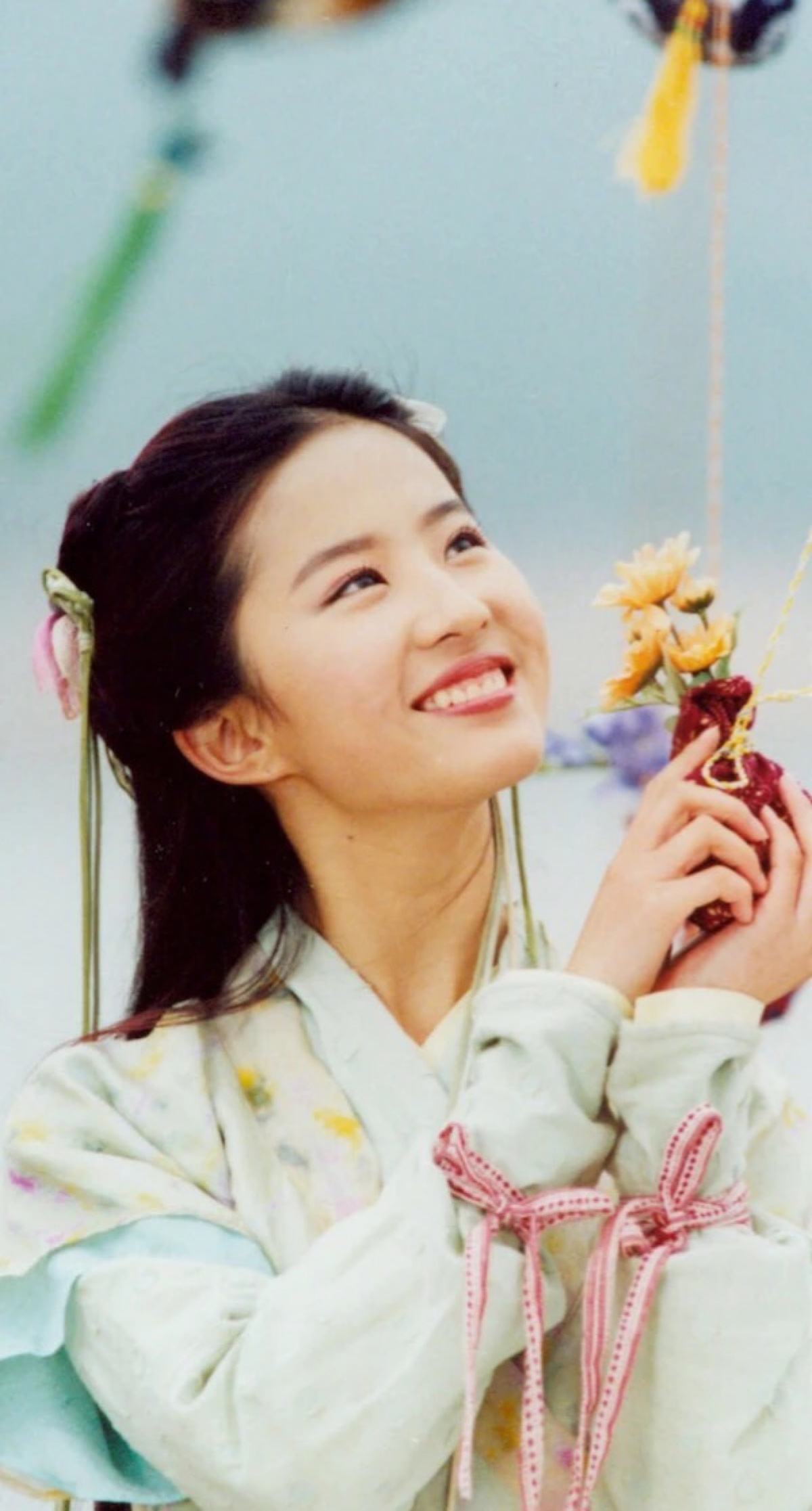 刘亦菲所饰演的赵灵儿灵动可爱,也是刘亦菲的颜值巅峰。双手手拿邹菊,笑得比花还要灿烂。