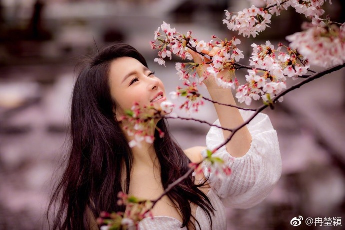 4月19日,邹市明妻子冉莹颖在微博晒出一组花下美照,冉莹颖在樱花树下穿着白色连身裙,十分飘逸,一双美腿十分诱人。