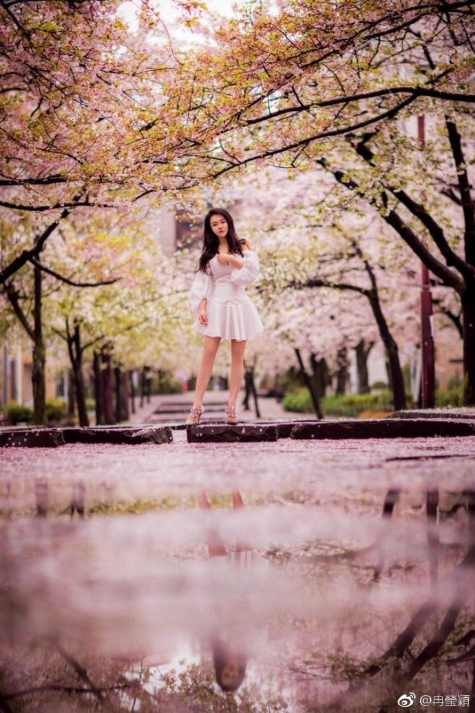 4月19日,邹市明妻子冉莹颖在微博晒出一组花下美照,冉莹颖在樱花树下穿着白色连身裙,十分飘逸,一双美腿十分诱人。