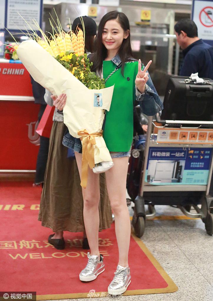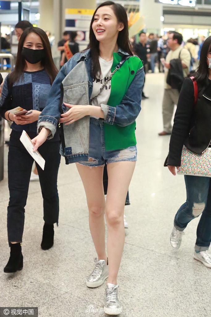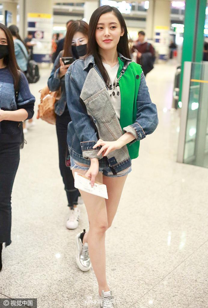 4月18日,张天爱离京现身首都机场,穿短裤露美腿,边走还边做伸展操。视觉中国/图