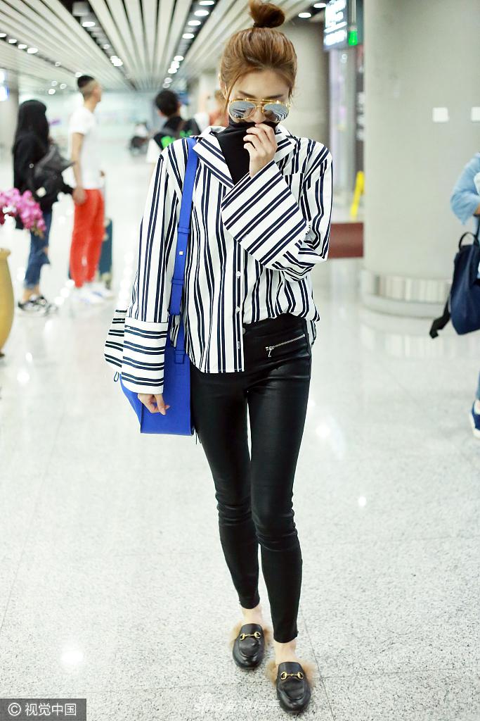 18日,江疏影穿“病号”条纹衬衫回京现身机场,梳丸子头潮范儿十足,躲衣领后偷笑被抓拍。