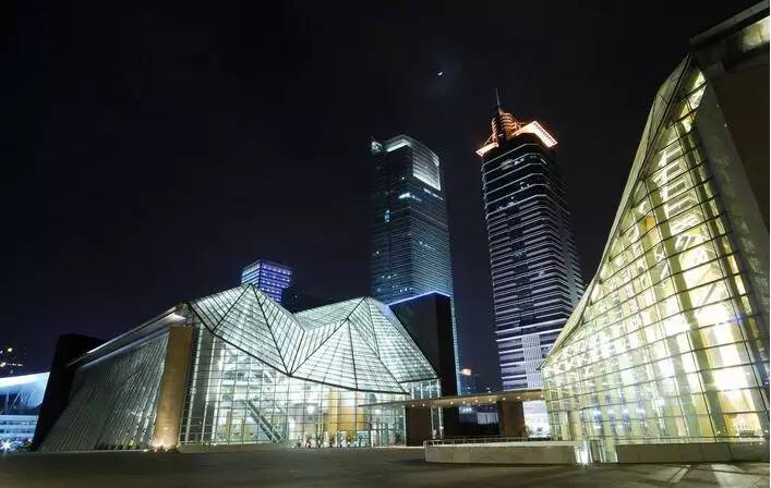 深圳文化中心坐落于深圳市福田中心区,由享誉世界建筑界的日本著名建筑设计大师矶崎新主持设计。建筑造型优雅独特,分别由南面的图书馆和北面的音乐厅组成。与其他双子对称建筑一样,深圳文化中心也是南北对称,图书馆与音乐厅夜景不同光色,形成“一银一金”。