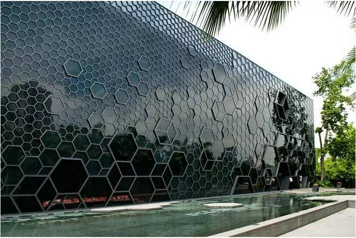 华·美术馆的仿生外形酷似蜜蜂的巢穴,因此又被称为“蜂巢”。美术馆是由旧厂房经过改造而成,六边形钢结构重叠组合的玻璃幕墙在旧有建筑外构筑一个独立表皮,在新锐的建筑外形下保留了过去建筑的历史和意义。