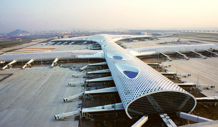 宝安机场新T3航站楼是由意大利设计师夫妇Massimiliano和Doriana Fuksas的Fuksas Studio所设计,30万平方米的宏伟空间有着曲面蜂窝状的外表,六边形的天窗和耀眼的苹果白。航站楼内部也是全白的,透过窗户的自然关给人一种身在一个网兜里的感觉。安检和行李寄存区的“岛”式设计很独特,树形的通风单元也别具一格。