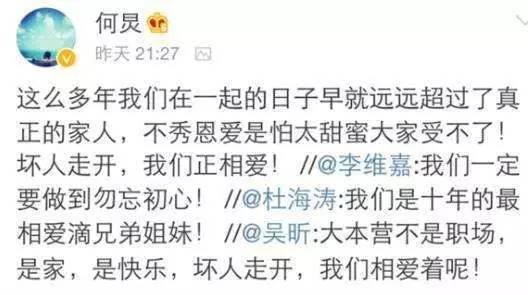 吴昕也回应说,“大本营不是职场,是家”,何老师也说:“这多年我们在一起的日子早就远远超过了真正的家人,不秀恩爱是怕太甜蜜大家受不了。”