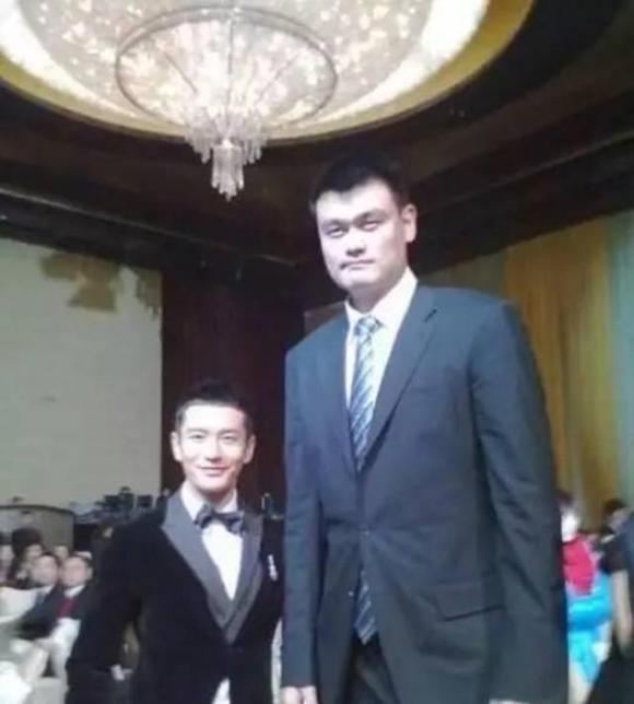 教主黄晓明和姚明在一起,一副小鸟依人的姿态。腰板挺得直直的,不过姚明的眼袋貌似有些抢镜呢!