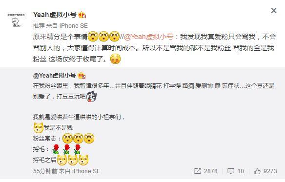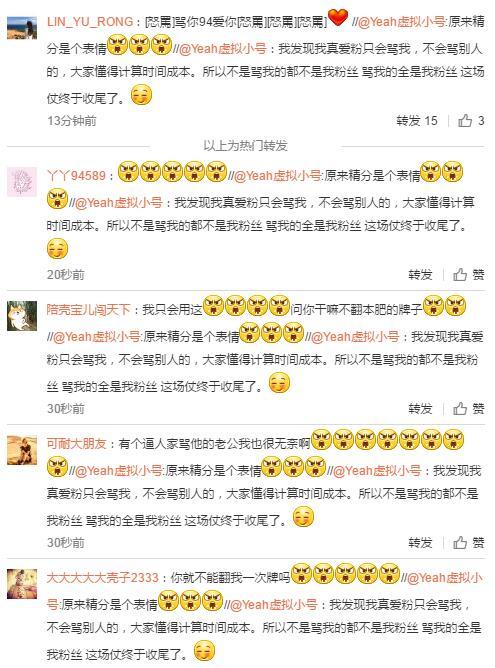 随后,她又转发这条微博并写道:“我发现我真爱粉只会骂我,不会骂别人的,大家懂得计算时间成本。所以不是骂我的都不是我粉丝,骂我的全是我粉丝,这场仗终于收尾了。”接着又表示“原来精分是个表情”,配上“怒骂”的表情。