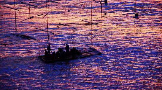 涨潮时海上忙碌的船只穿梭在浮标竿影(紫菜架)之间,