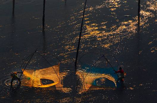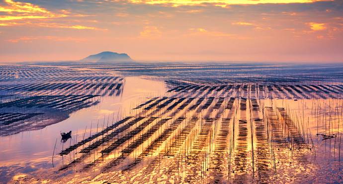 涨潮时海上忙碌的船只穿梭在浮标竿影(紫菜架)之间,