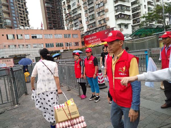 今天,中英街有一支格外显眼的队伍,他们身着统一红色马甲,头戴红色帽子,在熙攘的人群中往复穿梭。他们兵分三路,一组分派在客流量最大的中英街关前广场,引导他们出入,热心解答游客的询问;另一小组驻点海关检查大厅,见游客双手提满商品,他们就会主动上前,帮忙把商品放到传送带上,通过安检后再协力提起;其余组员分散在购物主街,组织游玩结束欲出关的游客有序排队,见他们满头汗珠,但仍忙得不亦乐乎。