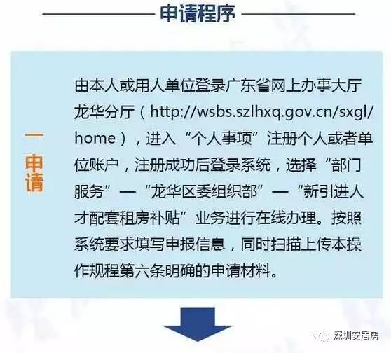 (一)申请。由本人或用人单位登录广东省网上办事大厅龙华分厅(http://wsbs.szlhxq.gov.cn/sxgl/home),进入“个人事项”注册个人或者单位账户,注册成功后登录系统,选择“部门服务”—“龙华区委组织部”—“新引进人才配套租房补贴”业务进行在线办理。按照系统要求填写申报信息,同时扫描上传本操作规程第六条明确的申请材料。