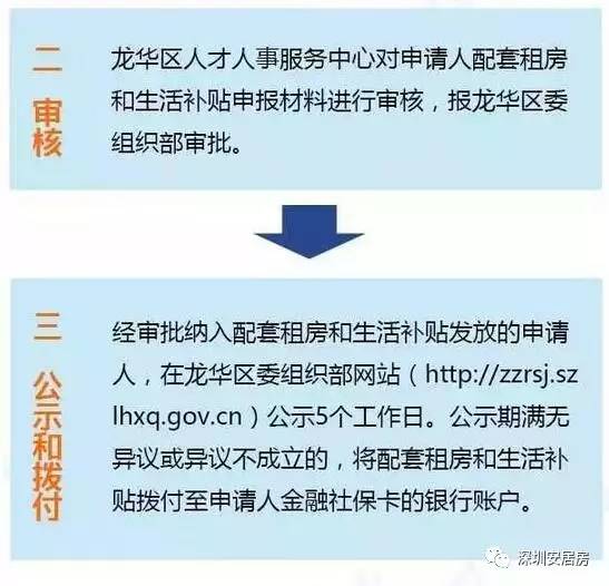 (三)公示和拨付。经审批纳入配套租房和生活补贴发放的申请人,在龙华区委组织部网站(http://zzrsj.szlhxq.gov.cn)公示5个工作日。公示期满无异议或异议不成立的,将配套租房和生活补贴拨付至申请人金融社保卡的银行账户。