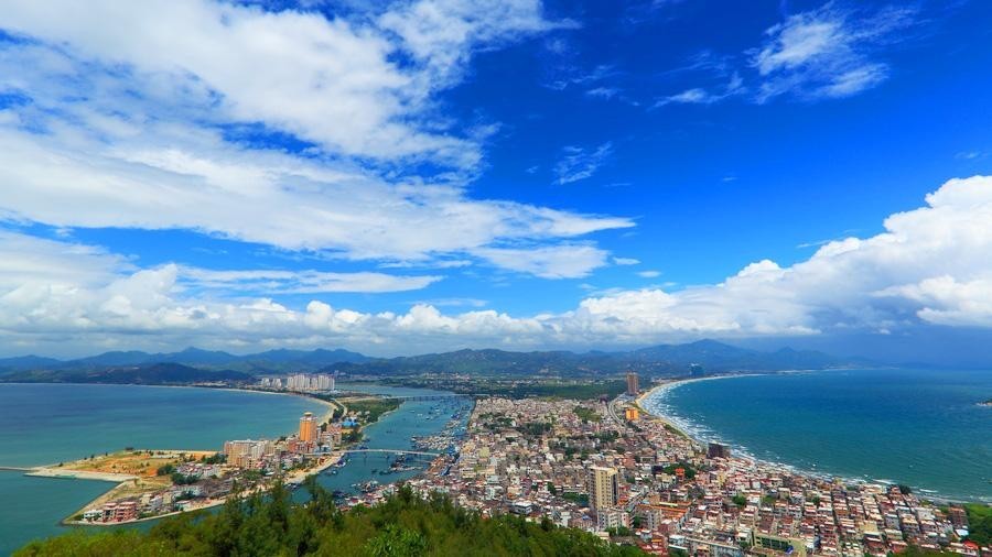 整个海湾从空中俯瞰好像两轮背对的新月,故名双月湾。双月湾的奇特之处在于,这里左湾水平如镜,右湾波涛汹涌,一静一动。