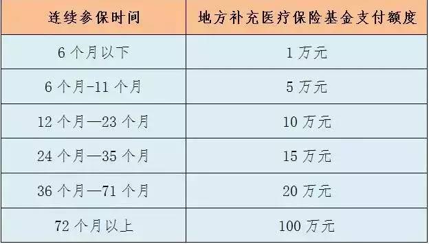 每个医疗保险年度地方补充医疗保险基金的支付限额,根据参保人连续参加地方补充医疗保险的时间按下列标准执行: