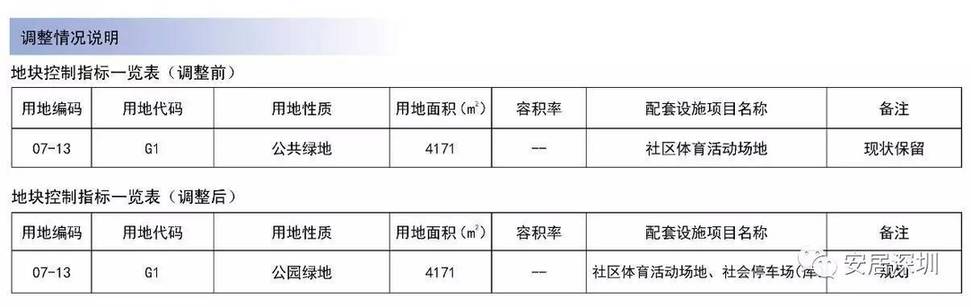 拟对[后海地区]法定图则07-13地块进行调整,调整后的地块用地性质为公园绿地,用地面积为4171平方米,配套设施项目名称为社区体育活动场地、社会停车场(库),备注为规划。