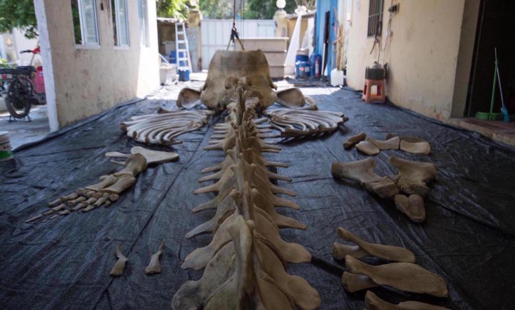 4月28日下午,经过18天的浸泡,误闯深惠海域的抹香鲸的骨骼从长3米、宽1.5米、高1.2米的不锈钢池中捞出,首次成型展示。厦大团队公布了他们的新发现—— 这头抹香鲸“孕妈”的上颌有14颗牙齿。该团队此前解剖过五头雄性抹香鲸,均未有类似发现。目前,他们正在向惠州市海洋与渔业局申请,对上齿、下齿做切片对比,进一步确定其科研价值。