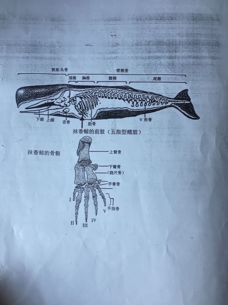 经过1个多小时的摆弄,零散的250多块骨头出落成一副完整的抹香鲸骨骼。这是上颌骨、下颌骨、脊椎骨、肋骨、指骨、胸骨、舌骨、V形骨、腰痕骨董仁春熟练地为记者介绍。有趣的是,抹香鲸的鳍指和人的手一样,有着明显的五指结构。“这头抹香鲸右鳍有25节骨头,左鳍只有24节骨头,在类似人的小指位置上,两节骨头连在一起。”厦大生物博物馆馆长、厦门市水陆生物研究所所长童慎汉说,很可能,它曾经受过伤。