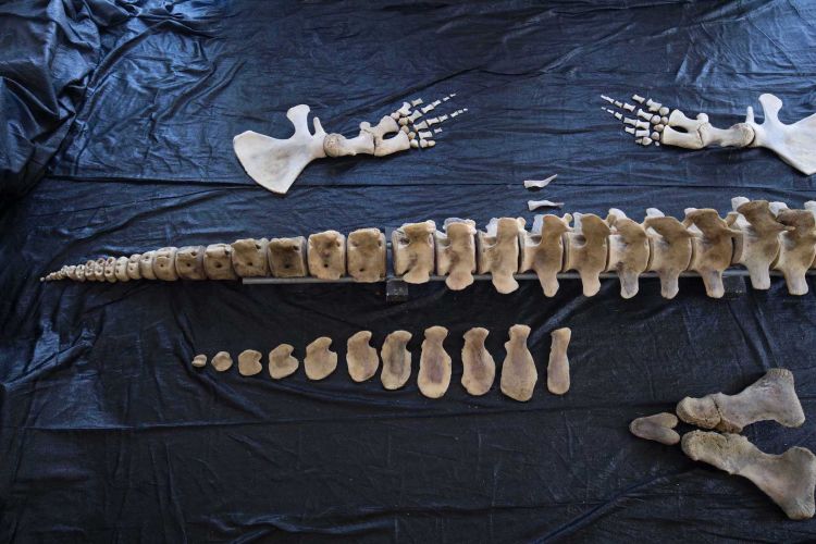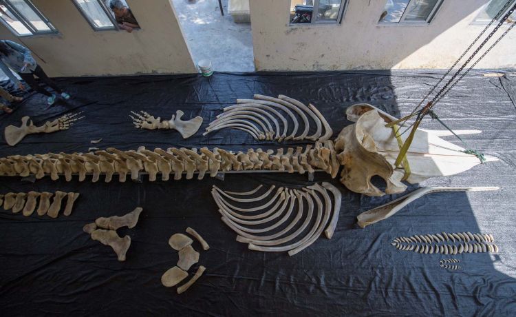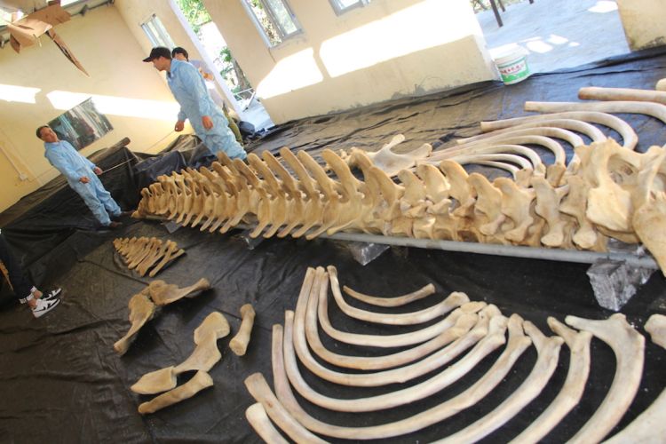 4月28日下午,经过18天的浸泡,误闯深惠海域的抹香鲸的骨骼从长3米、宽1.5米、高1.2米的不锈钢池中捞出,首次成型展示。厦大团队公布了他们的新发现—— 这头抹香鲸“孕妈”的上颌有14颗牙齿。该团队此前解剖过五头雄性抹香鲸,均未有类似发现。目前,他们正在向惠州市海洋与渔业局申请,对上齿、下齿做切片对比,进一步确定其科研价值。