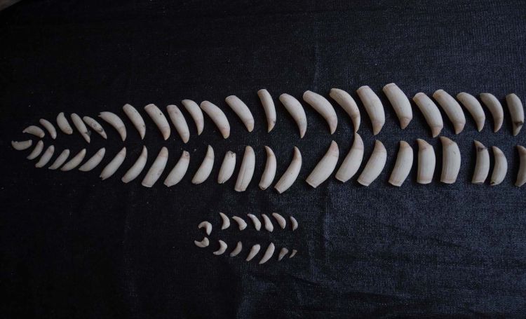现场还有51颗状如香蕉的鲸齿。其中,两排腰果般的小鲸齿特别引人注目。“这是上颌齿。”童慎汉说,6起抹香鲸解剖标本制作中,这是他们第一次发现抹香鲸上颌有牙齿,两侧各7颗。据了解,前五次都为雄性抹香鲸。此次是他们制作的唯一雌性抹香鲸标本。
