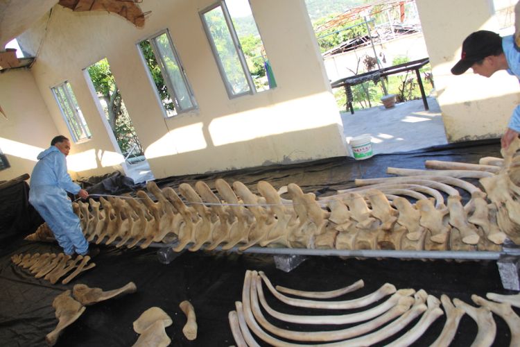 4月28日下午2时许,记者再次来到厦大生命科学学院科研教学实践基地,黄荣福、董仁春老师正按照抹香鲸骨骼结构摆放骨头。着经过浸泡晾干的骨头。骨头经过18天的清水浸泡,好似“洗白”了。“骨头上90%的肉去掉了,加上油脂去了部分,异味少了。”黄荣福说。