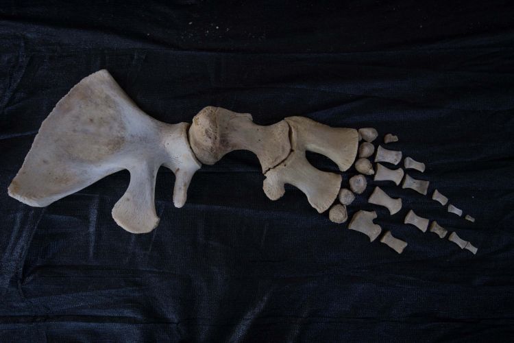 除了“双手”,抹香鲸还有一双严重退化的“脚”,叫腰痕骨。和其他骨头相比,这两根腰痕骨特别细小且弯曲。“这两根骨头严重退化,和其他骨头不相连。”童慎汉说。