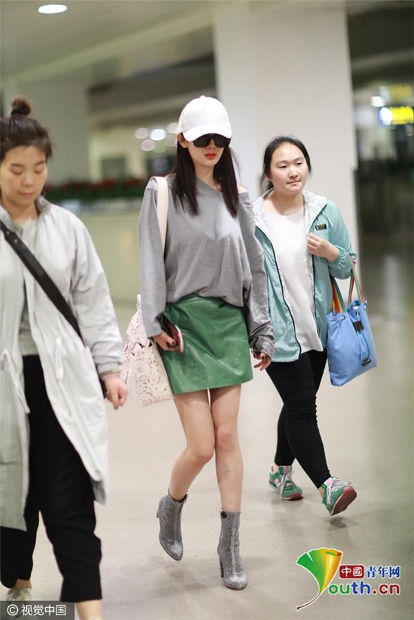 5月3日,杨幂出席素有“时尚界奥斯卡”之称的Met Gala后回国现身机场,打扮清新养眼十足,宽松露肩装难掩丰胸,穿绿色短裙露长腿万年不变,坐行李箱上打电话笑容满面,似与小糯米报平安。