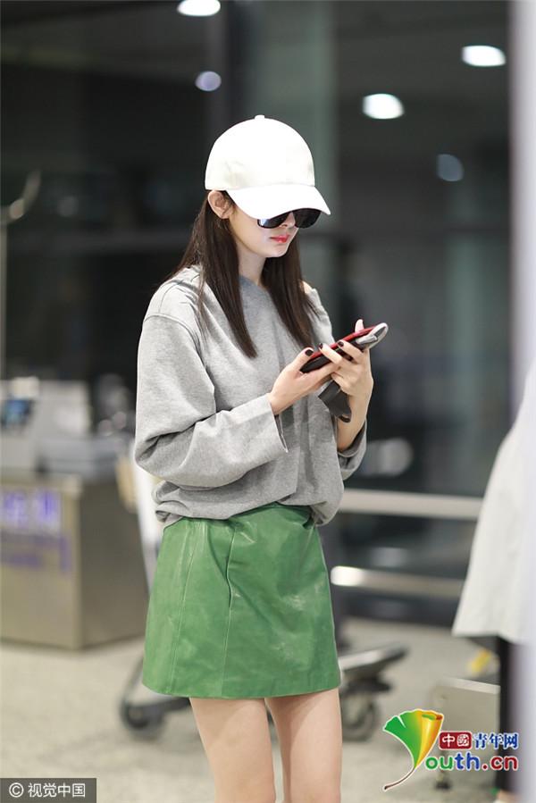 5月3日,杨幂出席素有“时尚界奥斯卡”之称的Met Gala后回国现身机场,打扮清新养眼十足,宽松露肩装难掩丰胸,穿绿色短裙露长腿万年不变,坐行李箱上打电话笑容满面,似与小糯米报平安。