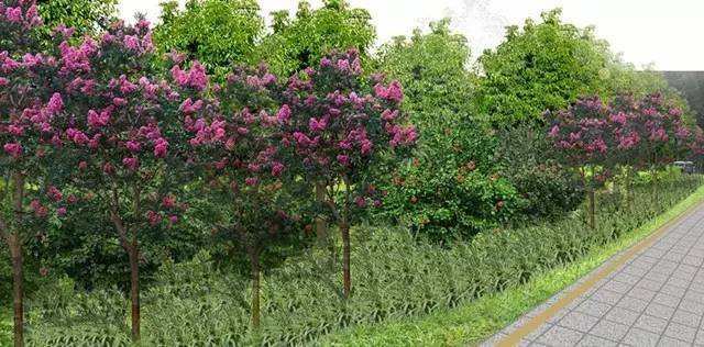 种植海南蒲桃、大红花形成绿色屏障,以遮挡道路南侧立体停车场,局部点缀小叶紫薇。