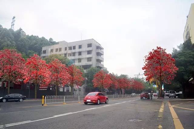 有了这一树红花的点缀,道路瞬间变美变迷人了有木有?!
