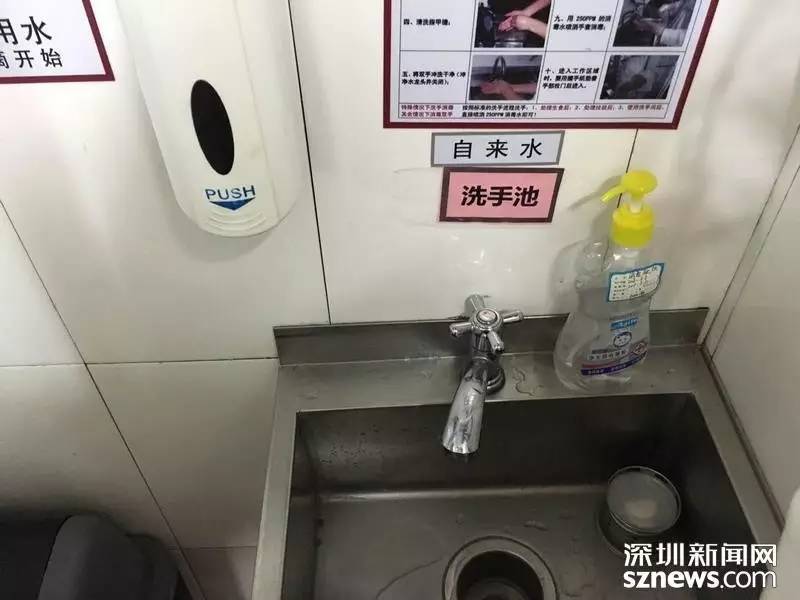 2凉菜预进间位置,洗手池没有设置成自动感应式或脚踏式,用手开关容易交叉污染。
