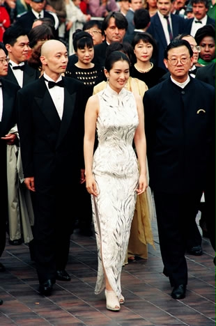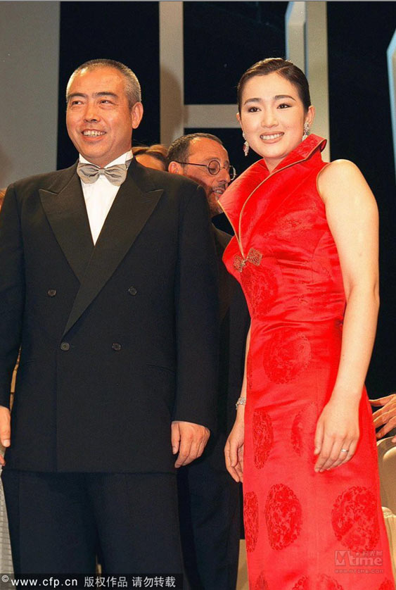 1998年和陈凯歌在戛纳亮相,穿着浓浓中国喜庆风格的大红色改良旗袍。