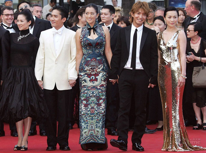 2004年,《2046》的主演们亮相红毯,巩俐穿着YSL的改良旗袍,有如女王一样站在正中间。多年来在戛纳的亮相,她可能是法国人最熟悉的中国女演员了。同场的章子怡穿着Givenchy的黑裙。