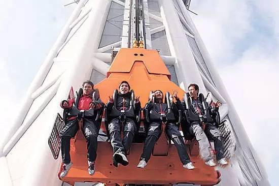 塔上有两组速降座椅,不仅有传统的“坐跳”,更有模拟自由落体的“站跳”,短短1秒多钟内体验30米的急坠,既可以凌空俯瞰羊城美景又可以体验高空速降。别说上去体验,小编光想象都觉得兴奋!