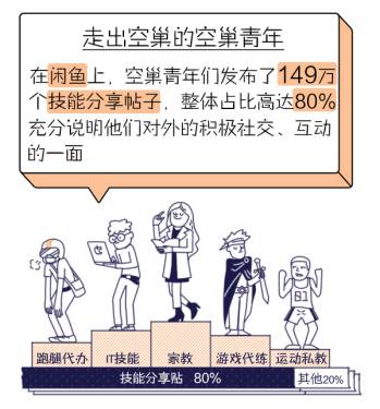 不要单纯地认为“空巢青年”只会“宅”,他们还爱大方与人分享自己的手艺和技能。据闲鱼数据显示,在闲鱼的技能分享类目中,有超过80%的技能分享来自于“空巢青年”,贡献将近150万个技能分享帖子。主流技能分享有:家教服务、IT技能服务、游戏代练、跑腿代办等等。