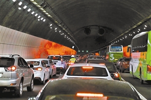 4月30日,惠深沿海高速林场隧道市区往大梅沙方向车流。