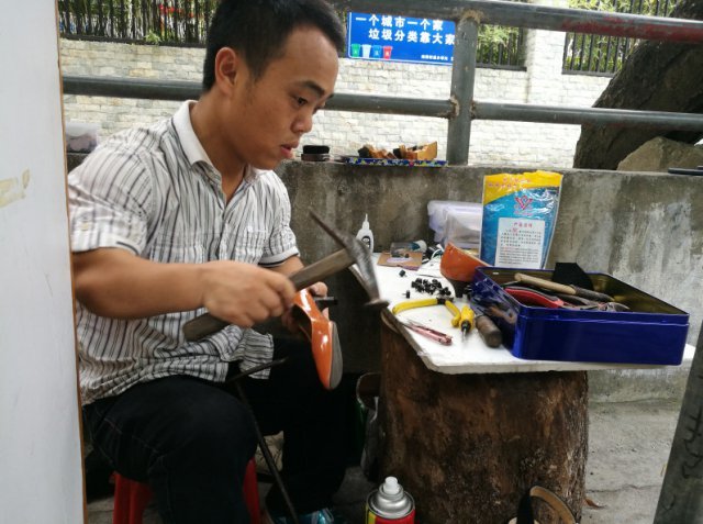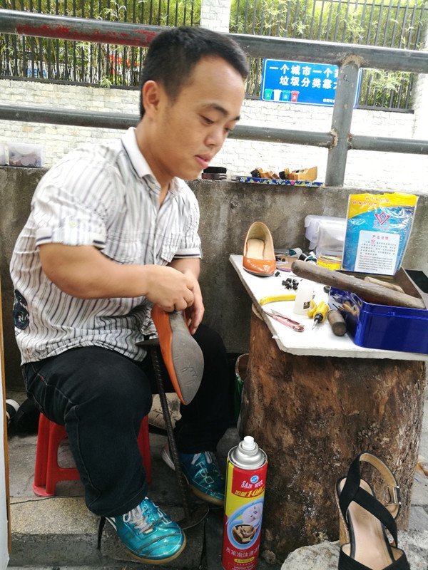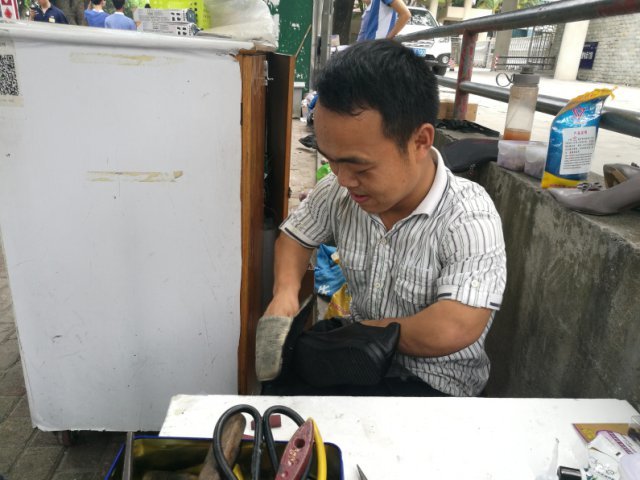 2017年5月3日上午,罗湖区解放路阳光正暖,偶有微风拂过。树荫下的汪苏明正低头专注地为一双橙色高跟鞋钉上新的鞋钉,他将高跟鞋底朝天套在支架上,左手将鞋钉对准鞋跟,右手挥动铁锤,"哐哐"几声闷响后,一颗崭新的鞋钉便精准地嵌入到鞋跟里了。女顾客满意地接过修好的鞋子穿上,付钱后道一句多谢,汪苏明则回之以微笑。汪苏明是浙江衢州人,2009年来到深圳罗湖区成为一名修鞋匠,至今已经在深工作8年,他靠着精湛的手艺和乐观的精神赢得了附近居民的尊重与赞美。汪苏明的另一个身份是,身高只有1米3的侏儒症患者。