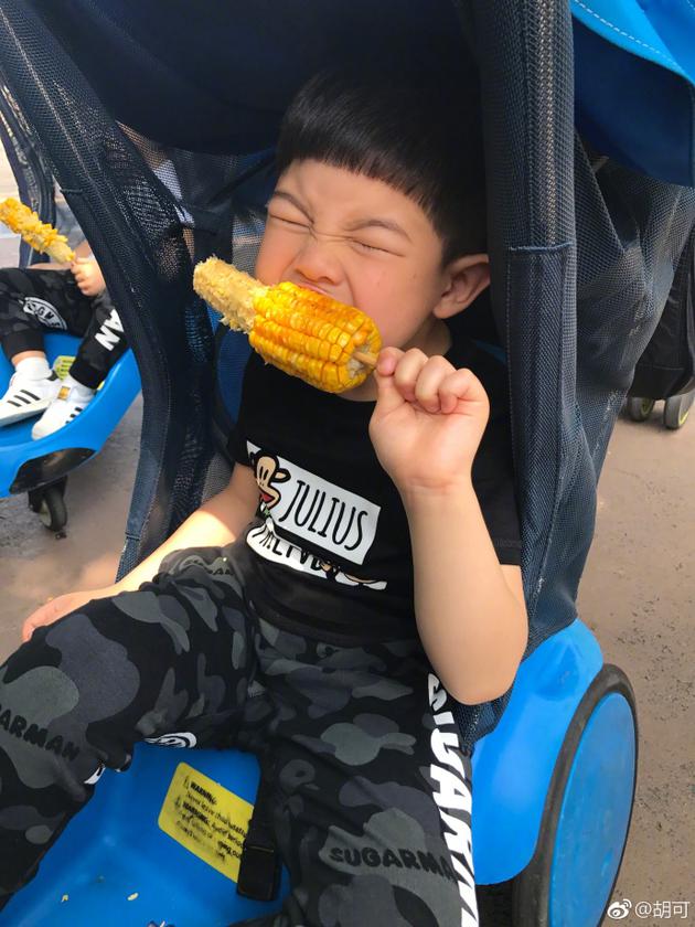 5月3日晚,胡可通过微博晒出一组安吉和小鱼儿吃玉米的照片,并称:“请问谁的玉米吃的比较帅呢?”照片中,兄弟俩坐着推车,安吉拿着玉米啃得非常干净,但表情也很夸张,相对于哥哥,弟弟小鱼儿就显得豪放多了,玉米被他啃得“伤痕累累”,十分的可爱。