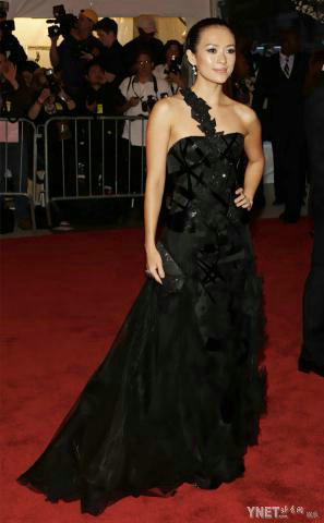 2008年MET GALA 主题为“超级英雄:时尚和幻想”,章子怡扎清爽马尾,配黑色褶皱花朵单肩抹胸礼服出场。外国评论员一致好评,“全身上下没有一处错误,黑色礼服与不规则几何图形高贵冷艳”。