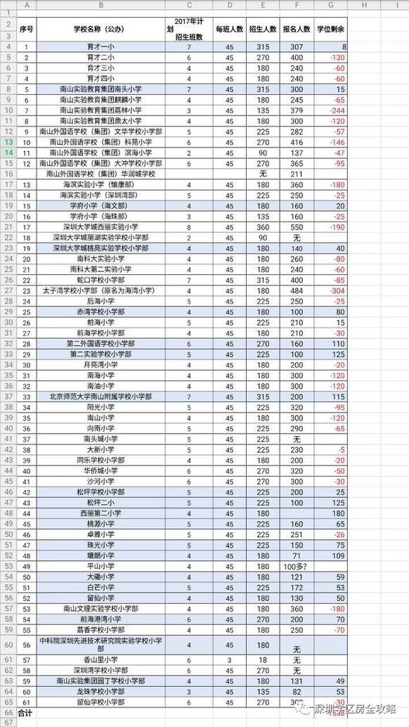 从上面的数据我们可以看出,太子湾学校小学高达304个,排第二的是南实荔林小学,南山区缺口达三位数的学校就有11个,且集中在南头、蛇口片区,西丽松坪等教育资源稍弱的地方学位则有剩余,教育资源分配不均,优质资源过于集中也是南山学位缺口大的一个原因。