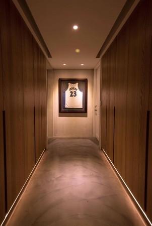 镜头移往走廊,灰黑色的地板搭配木制墙面,看起来非常有质感,走廊尽头挂着一幅乔丹签名球衣的裱框作品。镜头再移到外头,还有一个小而美的阳台,摆有小桌子、椅子,主人可以坐在那边看到外面的树林美景。