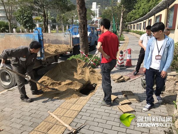 随后,时卫干一行来到梅沙街道,针对梅沙街道环碧路人行道存在地陷隐患问题进行现场调研。据了解,近期,梅沙街道环碧路北段人行道多处地面砖块因外力撞击破损,居民打开个别砖块目测到该段下方土层存在脱空现象,其中盲道位置形成长条型坑槽,地砖悬空于路面之上,坑深约1米,宽约50厘米,长至少超过300米,存在安全隐患。
