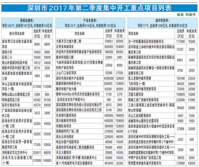 据了解,今年深圳列入省重点项目54个,总投资超5000亿元;市重大项目503个,总投资超1.7万亿元。今年一季度,建设中的327个重大项目完成投资超350亿元,完成年度计划24.6%。二季度集中动工项目中,坪山云轨旅游专线试验项目总投资41.8亿元,全长16.7公里,单向高峰小时运能1-3万人。大疆天空之城大厦二期项目规划建设无人机企业总部集聚、研发创新、运营服务和综合配套服务四大功能区,建成后将成为集设计、测试、办公、生活配套等功能为一体的总部基地。共进电子宽带网络终端设备产业基地项目总投资10亿元,预计明年达产、年产值75亿元。