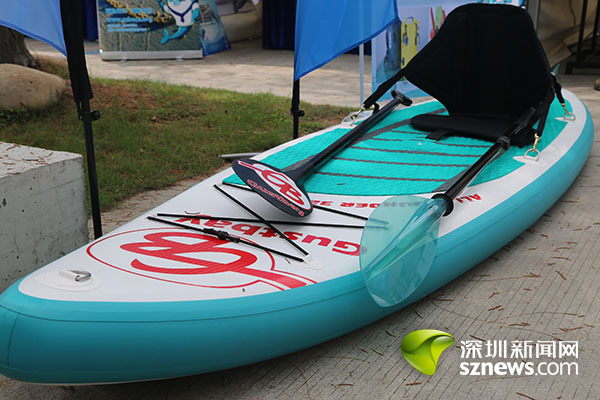 “这是我们公司的研发的Gustbay ISUP充气站立式桨板,除了具备市面上其它产品的功能外,它还可装配风帆航行。”极端水上运动制品有限公司网络销售经理陈丽锋说,SUP(Stand Up Paddle)站立式桨板是近几年新兴的水上运动,它不但适合不同年龄的人在不同水域使用,而且可作为多项水上运动的辅助工具,如冲浪、水上巡游、水上瑜伽、湖泊垂钓、沼泽探险等。该公司研发的Gustbay ISUP充气站立式桨板也是其中一种,记者在现场了解到,除了可装配风帆航行之外,这款长约3米宽约0.7米的Gustbay ISUP充气站立式桨板最大的特色就是,放气后可折叠起来放进背包或拉捍袋,非常方便易携。