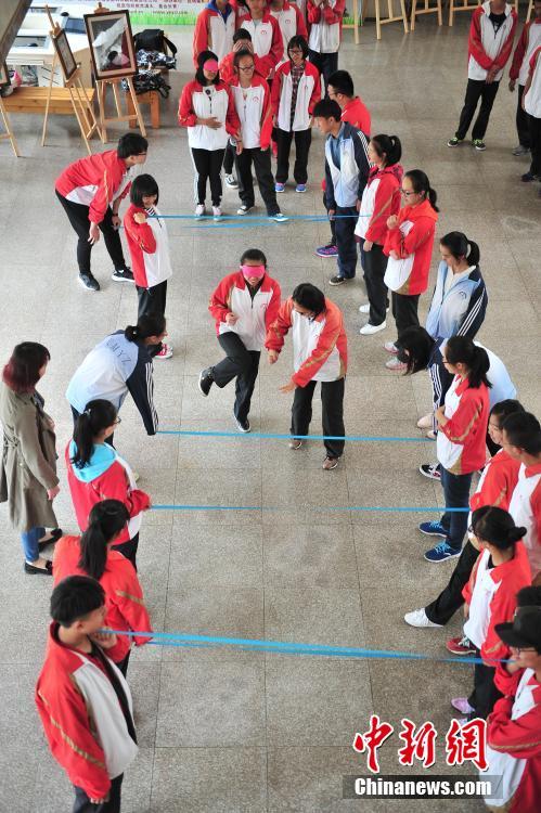 5月15日,高三学生进行团体心理游戏。随着高考临近,昆明市第一中学组织高三学生参加心理辅导课程,通过团体心理游戏,缓解考生紧张焦虑的情绪。中新社记者刘冉阳 摄