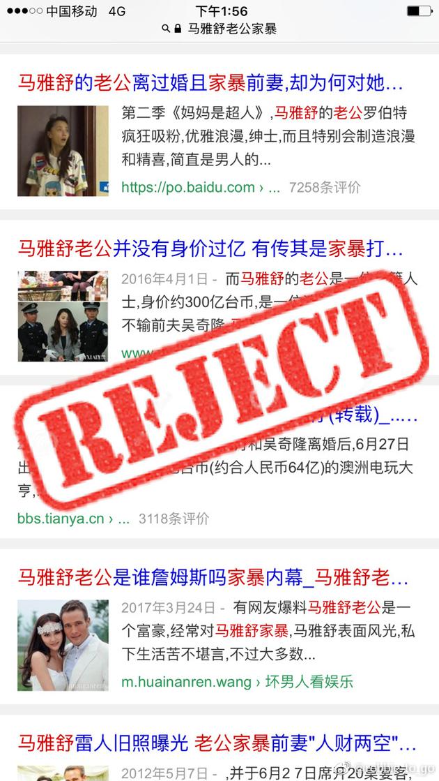 5月15日,马雅舒老公罗伯特通过微博对近日网络传闻“家暴前妻”作出回应,称:“有传言宣称我涉嫌对我的前妻实施家庭暴力。这是假新闻——事实并非如此——我没有家暴史。我调查了这个假消息的来源。从我的发现来看,这个登头条的假新闻来自于跟我完全没关系的法庭记录。请让我解释一下。首先,新闻引用的法庭记录来自美国缅因州——我的前妻和我从来没去过这个州。其次,这条引用的法庭记录的受害者名字并不是我前妻的名字。再次,这条法庭记录的施暴者的名字也并不是我的全名——如果真的是我,那法庭记录里肯定会包括我的完整的法律名字。最后,这条法庭记录的时间是我的前妻已经生活在德国而我已经生活在北京的时候——我们之间相隔几千公里远。因此,这些炒作完全就站不住脚!这是100%的假消息,想要给我的家庭带来诽谤和伤害。我痛斥这样的污蔑,以及发布这种低劣的假新闻背后的不道德的人。我跟我的前妻也讨论了这个假消息——她认为家暴这种谣言非常可笑并可悲——我们都认为这种虚假消息对那些真实遭受过家庭暴力的受害者来说是在伤口上撒盐。”并感谢大家对他的信任。